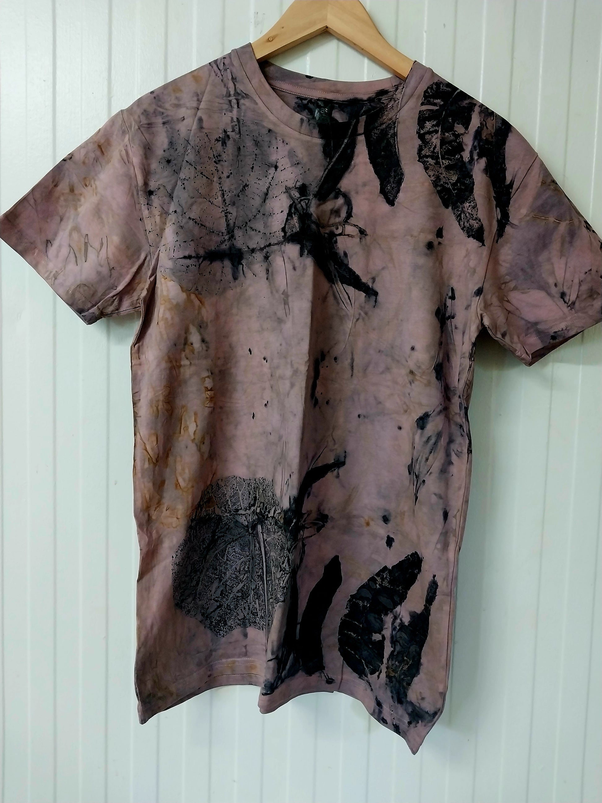 This unique t-shirt is dyed using native plants, recycled car parts and native dyes from the Australian bush. All t-shirts are hand dyed in Australia and are one off pieces of wearable art.