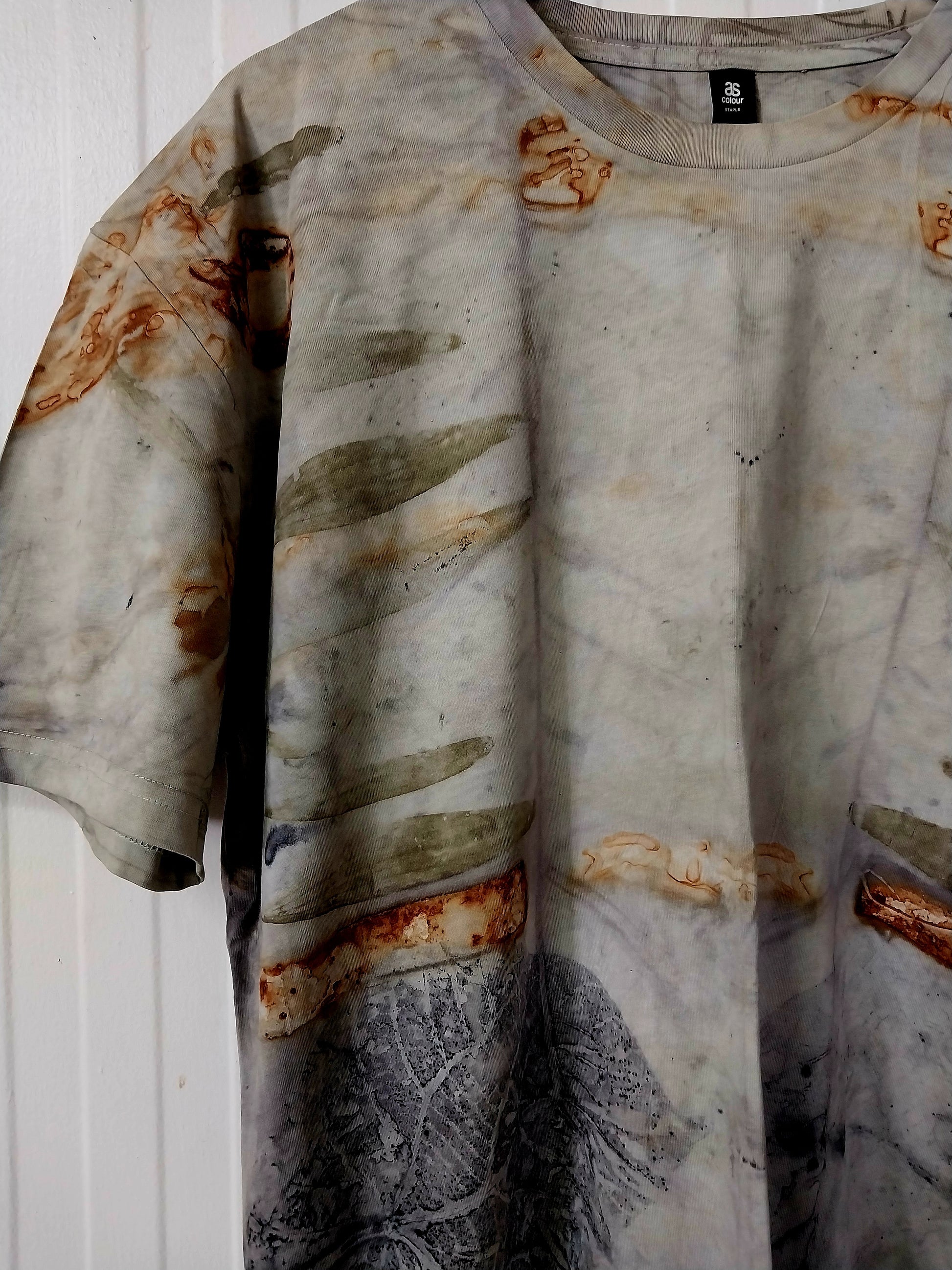 Hand dyed in the remote north of Australia using native plants, dyes and rusty car parts collected from some of the most remote car graveyards, this shirt is a one-off wearable piece of art. We only use high quality pre-shrunk AS color 180gsm shirts. All shirts are unisex and suitable for all climates.
