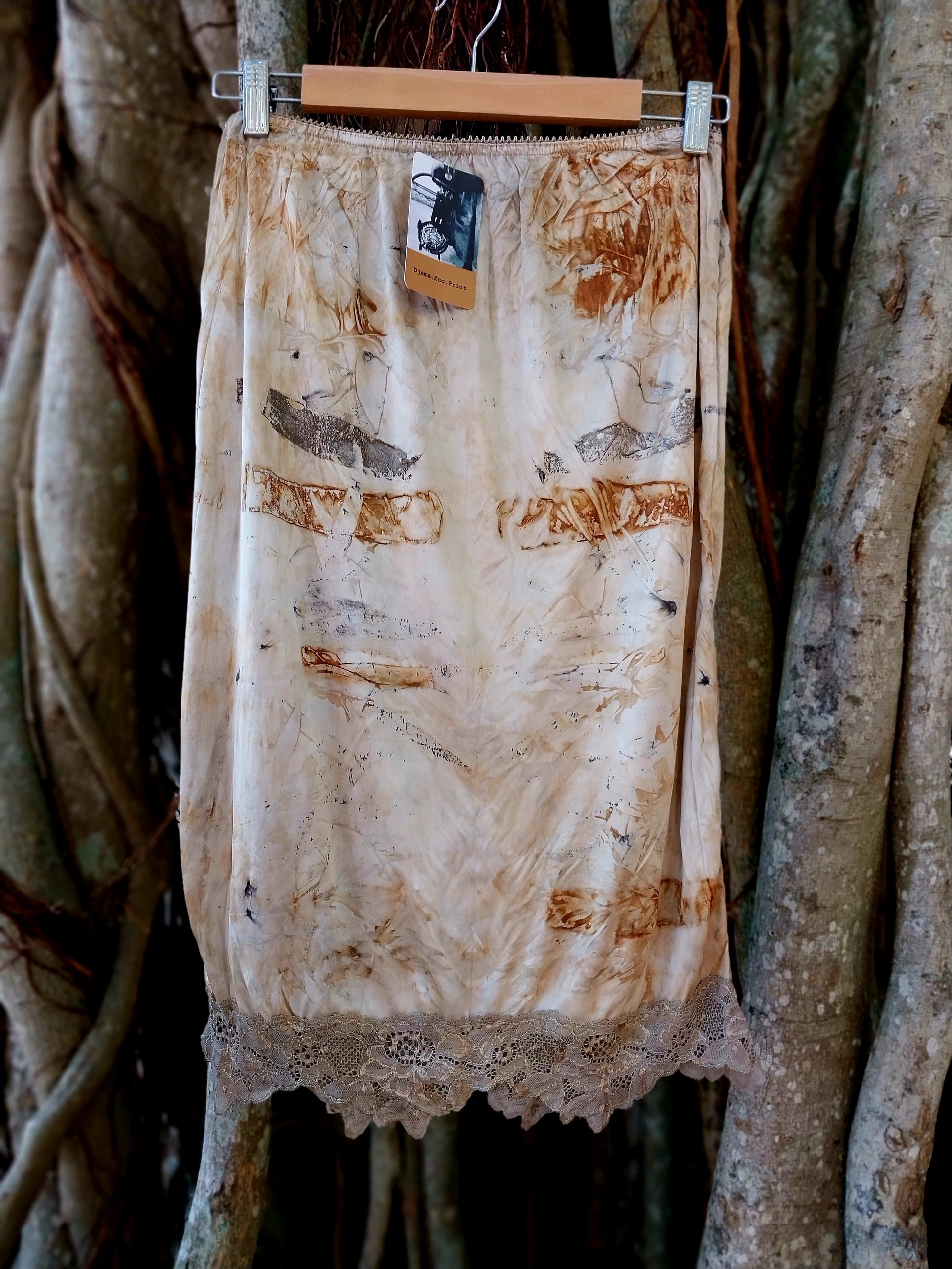 This one of a kind eco printed vintage petticoat skirt features delicate lace detailing that adds timeless sophistication. Crafted with sustainable materials, it offers a classic silhouette and gentle volume beneath dresses or skirts, blending vintage style with colours from the Australian bush.