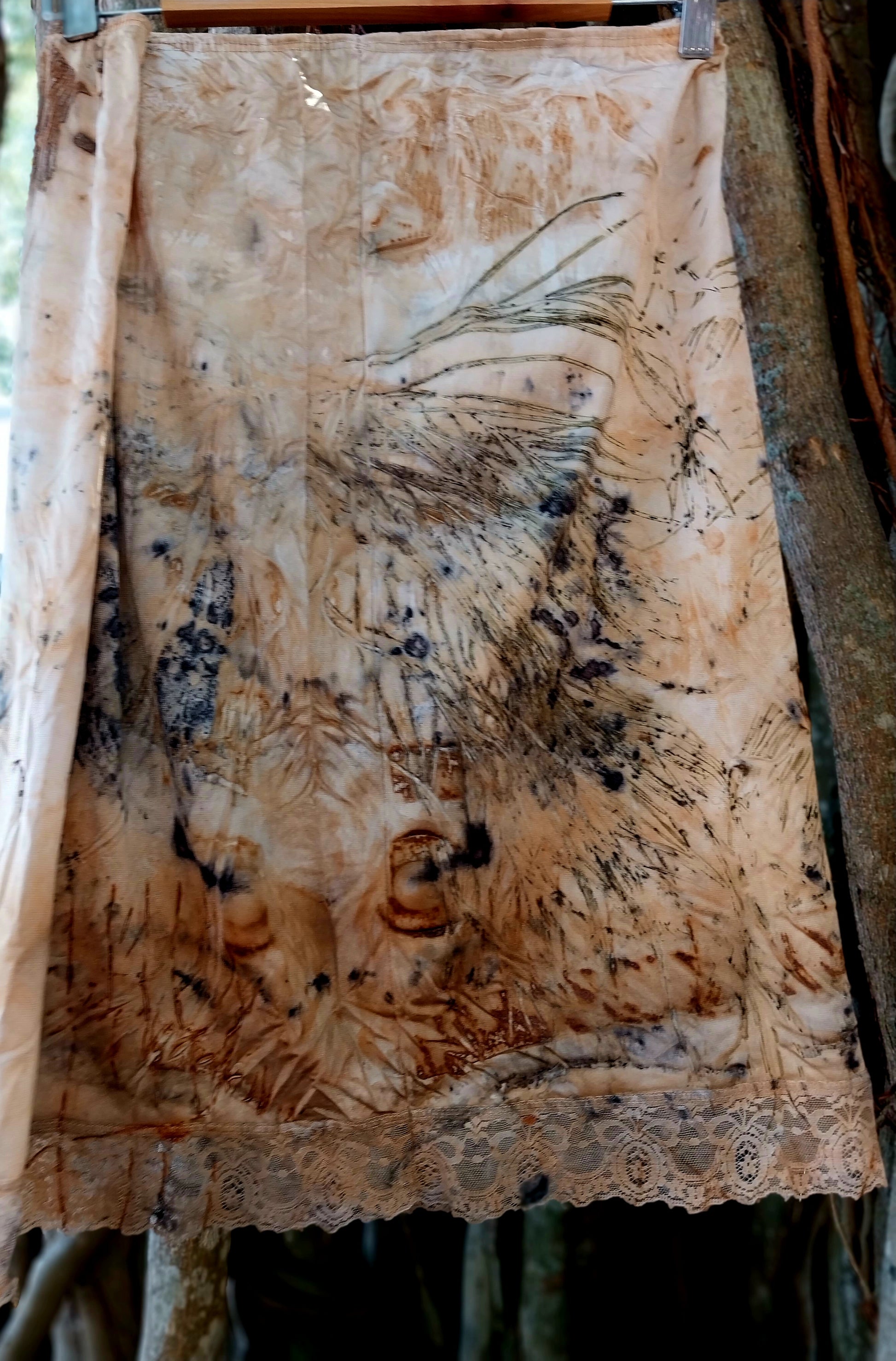 This one of a kind eco printed vintage petticoat skirt features delicate lace detailing that adds timeless sophistication. Crafted with native colors and rust, it offers a classic silhouette, blending vintage style with colors from the Australian bush.
