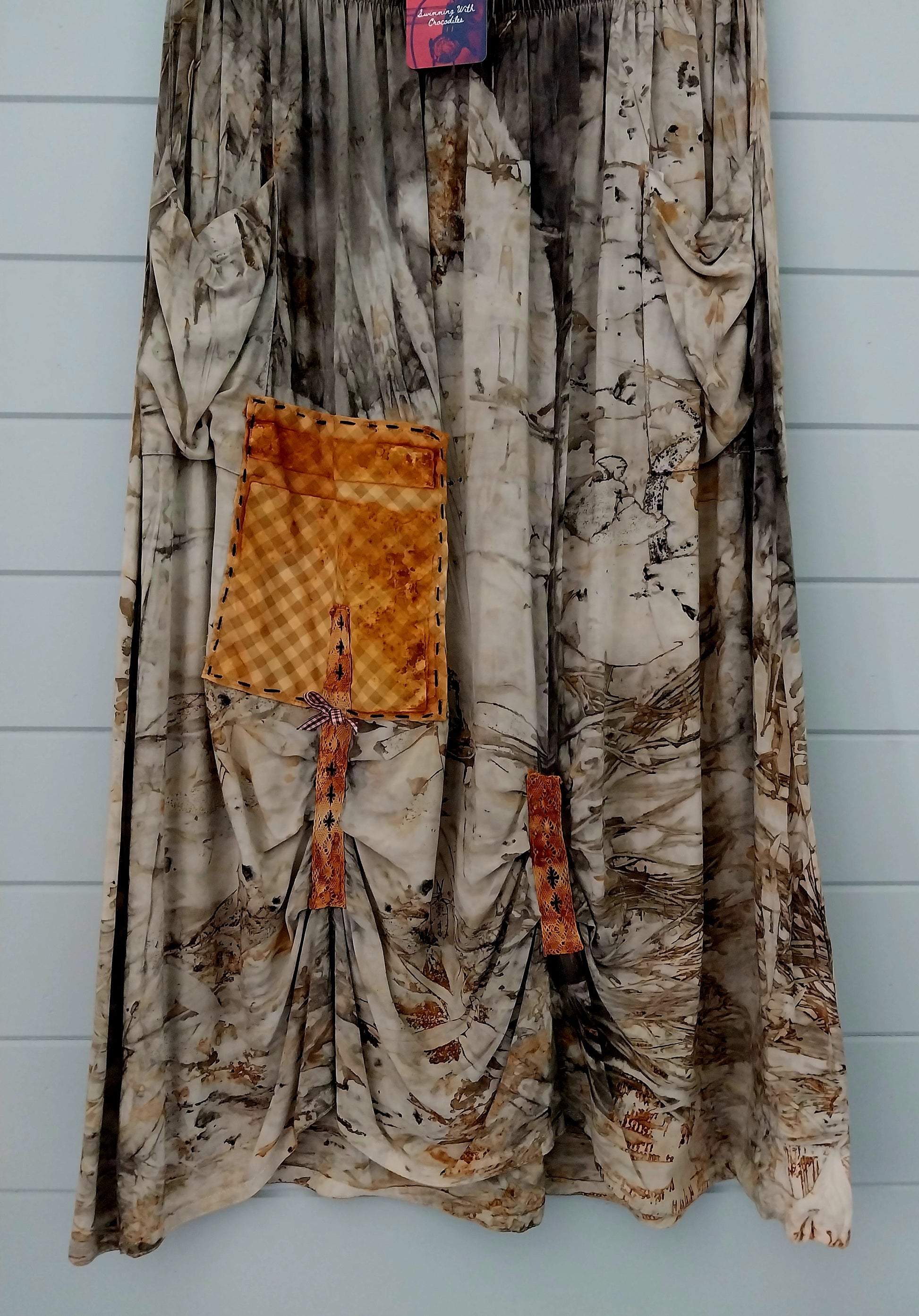 This beautiful hand dyed rayon skirt is a must have. Every skirt is hand dyed with Australian native plants and rusty car parts from the far north of Australia and then hand detailed with cute buttons and ribbons. Cool (literally) and easy to wear with big pockets these are a must have wardrobe item for summer, and a great layering piece for the cooler climates. Each Northern Hustler is a one-of-a-kind wearable piece of art with its own unique catalogue number.