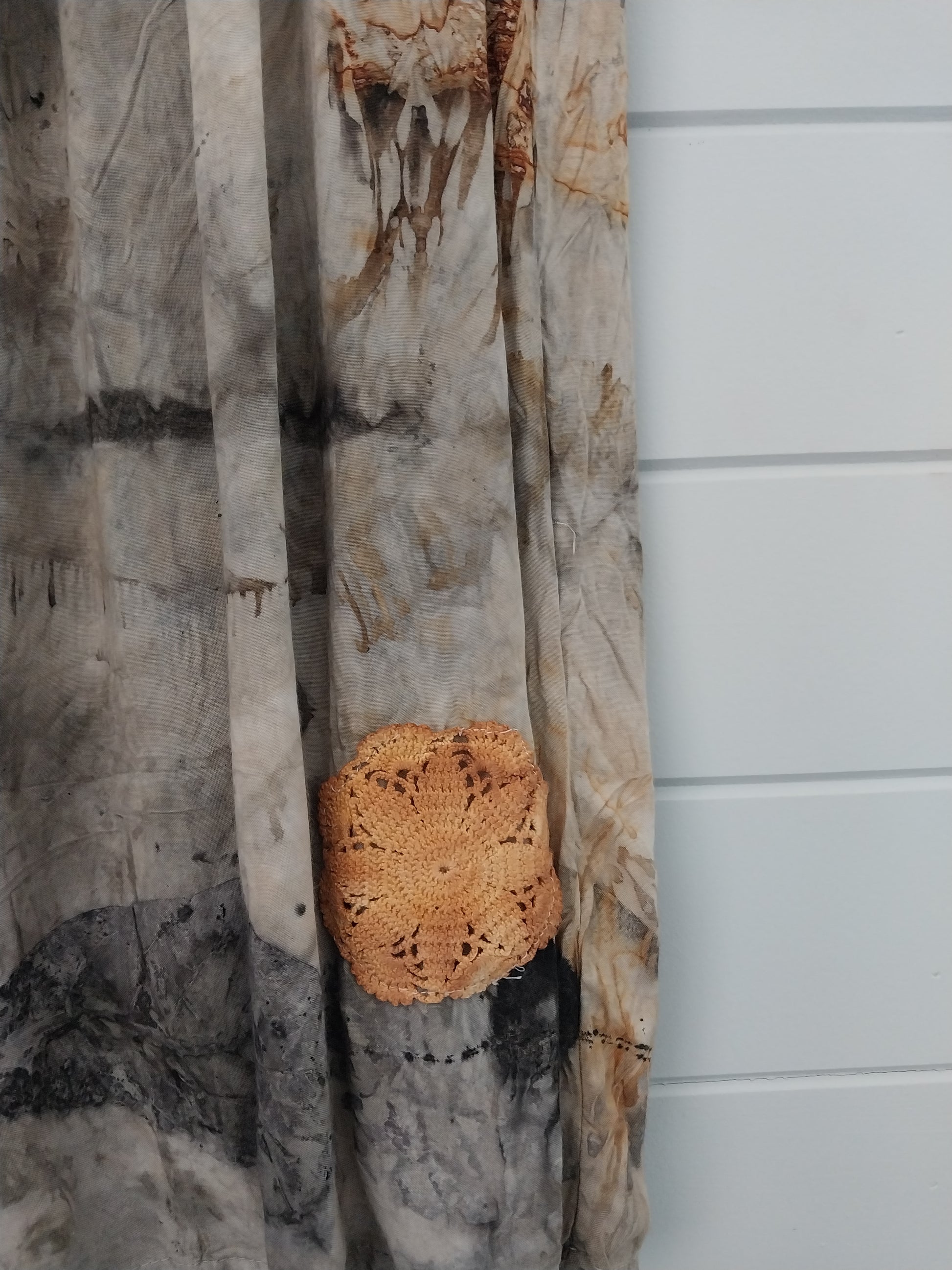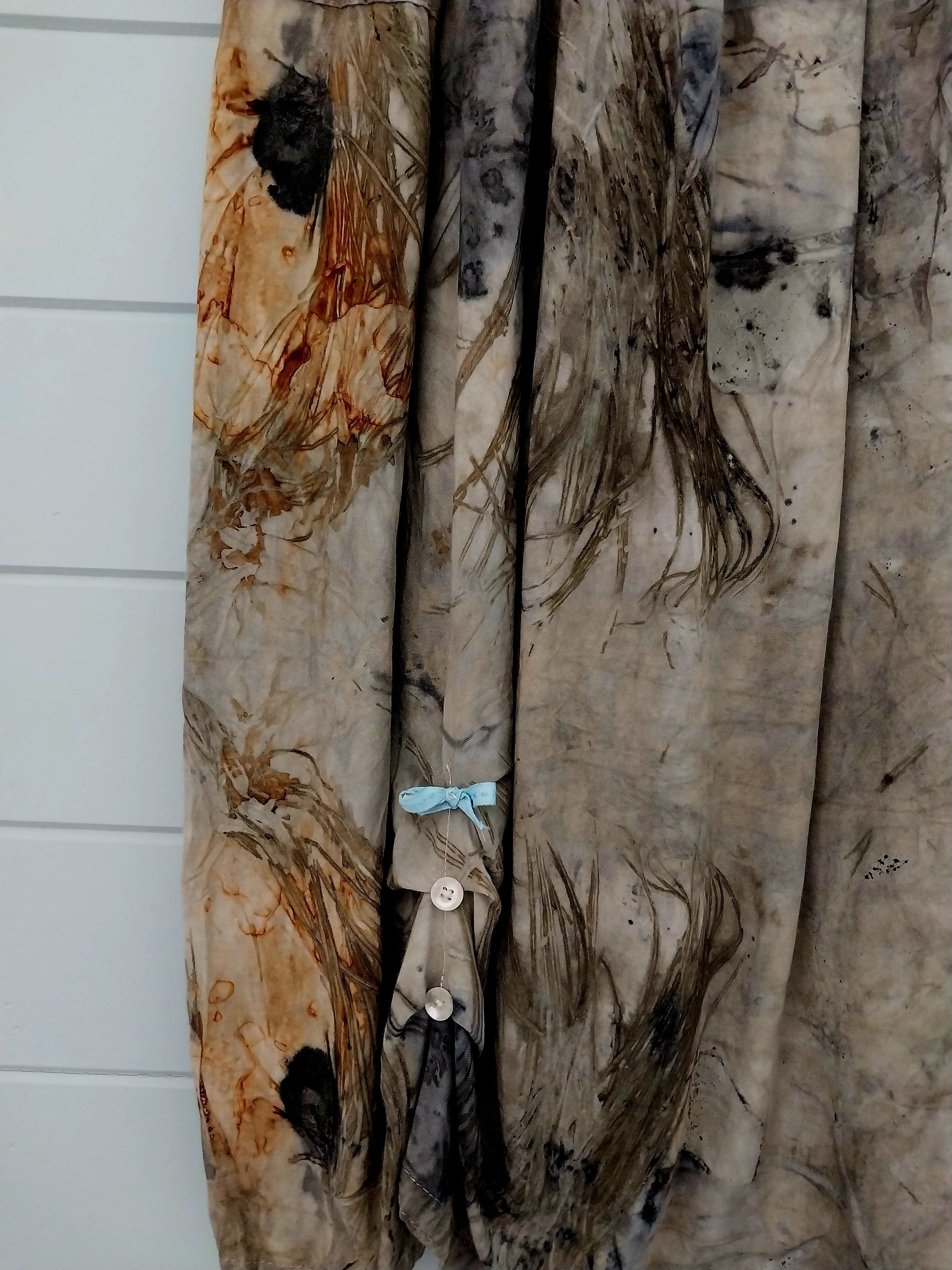 This beautiful hand dyed rayon skirt is a must have. Every skirt is hand dyed with Australian native plants and rusty car parts from the far north of Australia and then hand detailed with cute buttons and ribbons. Cool (literally) and easy to wear with big pockets these are a must have wardrobe item for summer, and a great layering piece for the cooler climates. Each Northern Hustler is a one-of-a-kind wearable piece of art with its own unique catalogue number.