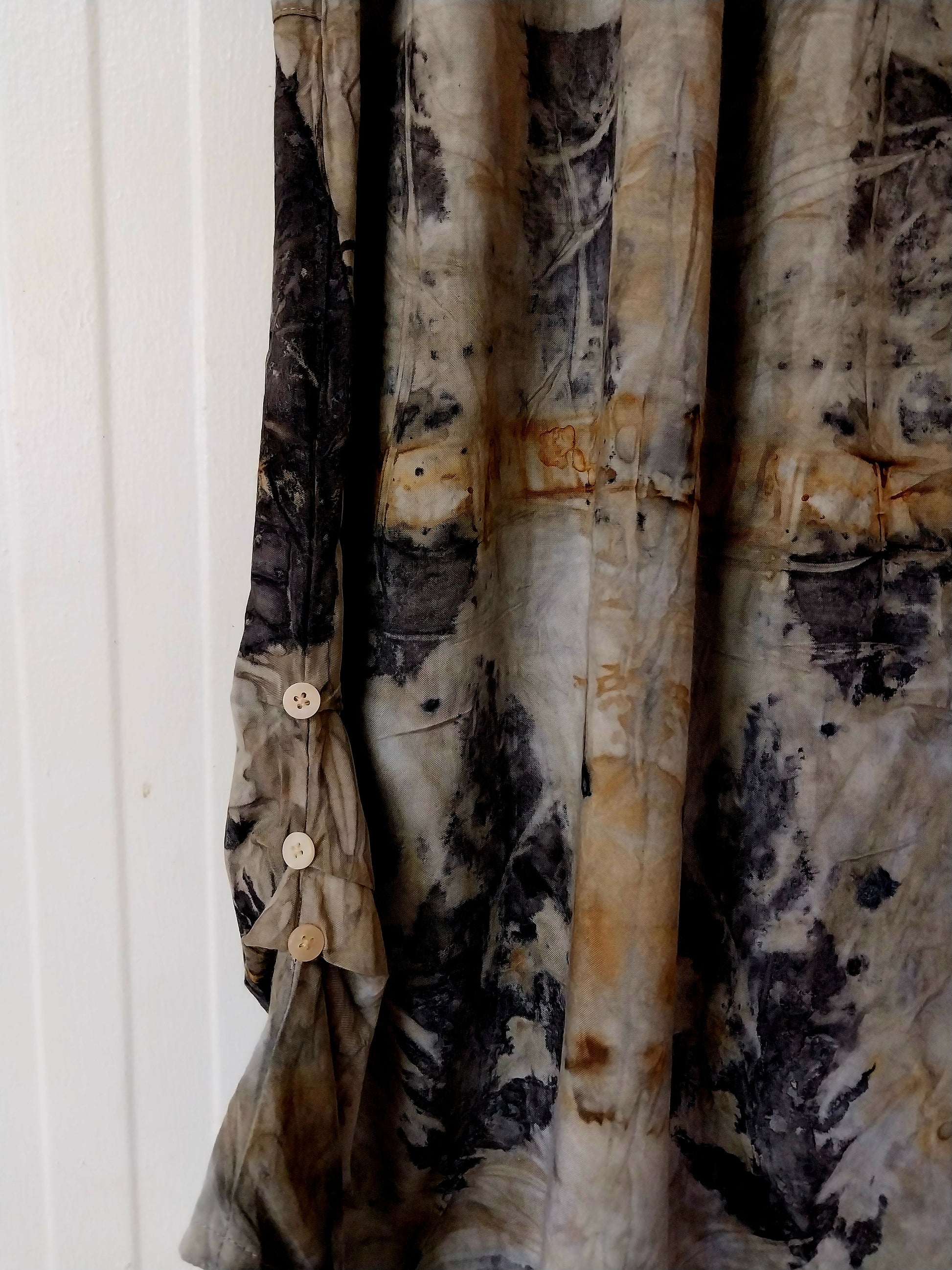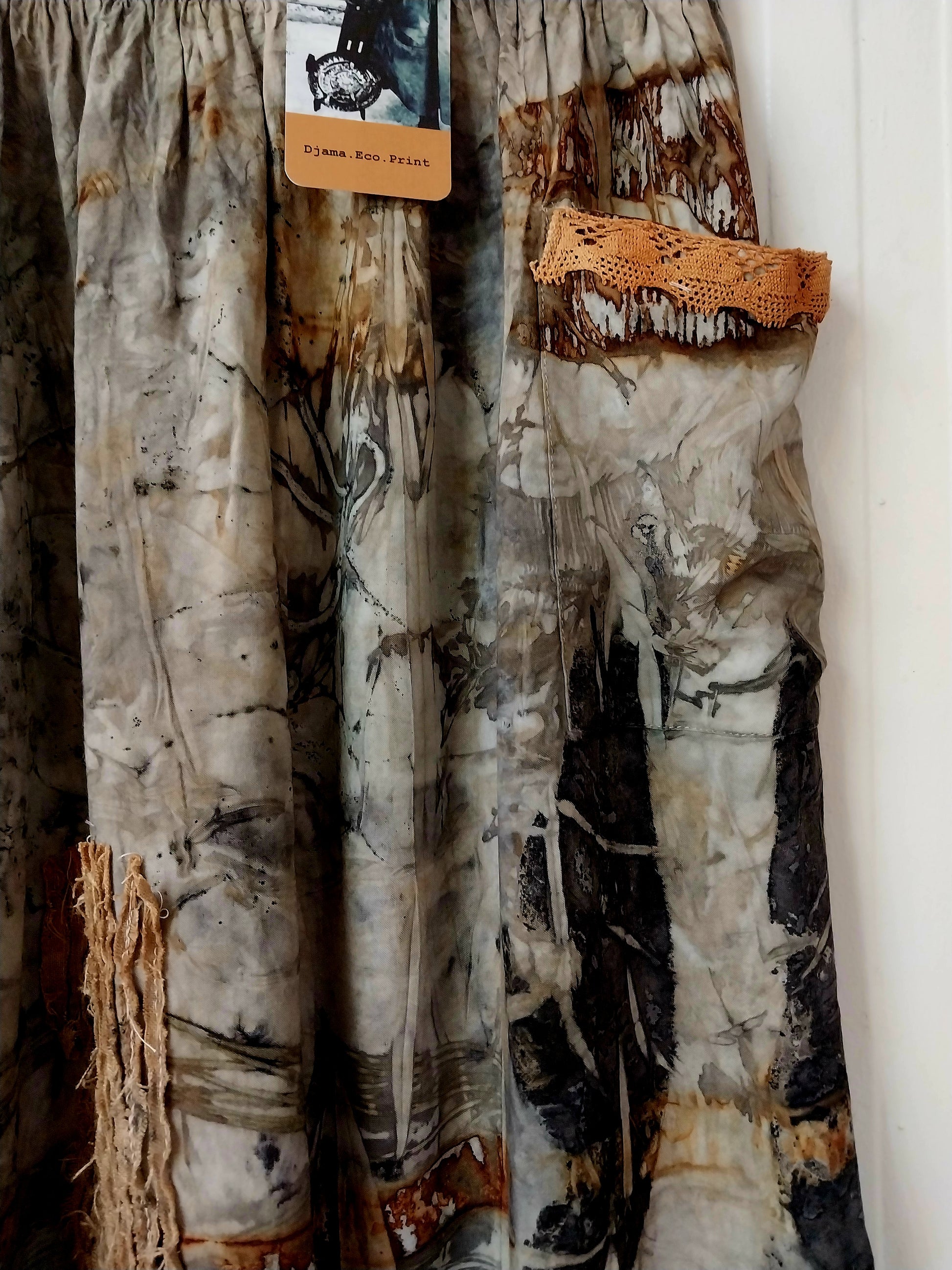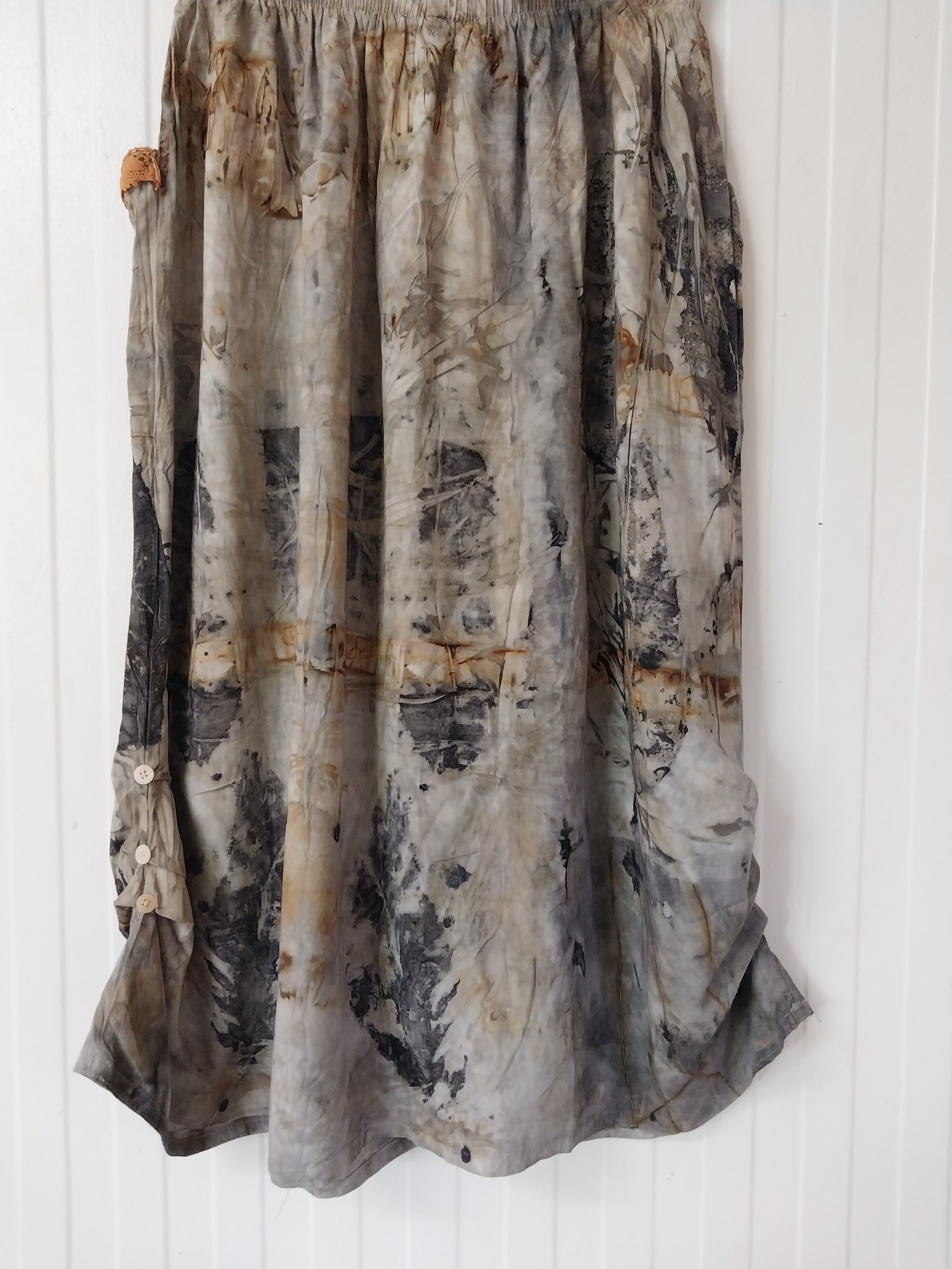 This beautiful hand dyed rayon skirt is a must have. Every skirt is hand dyed with Australian native plants and rusty car parts from the far north of Australia and then hand detailed with cute buttons and ribbons. Cool (literally) and easy to wear with big pockets these are a must have wardrobe item for summer, and a great layering piece for the cooler climates. Each Northern Hustler is a one-of-a-kind wearable piece of art with its own unique catalogue number.