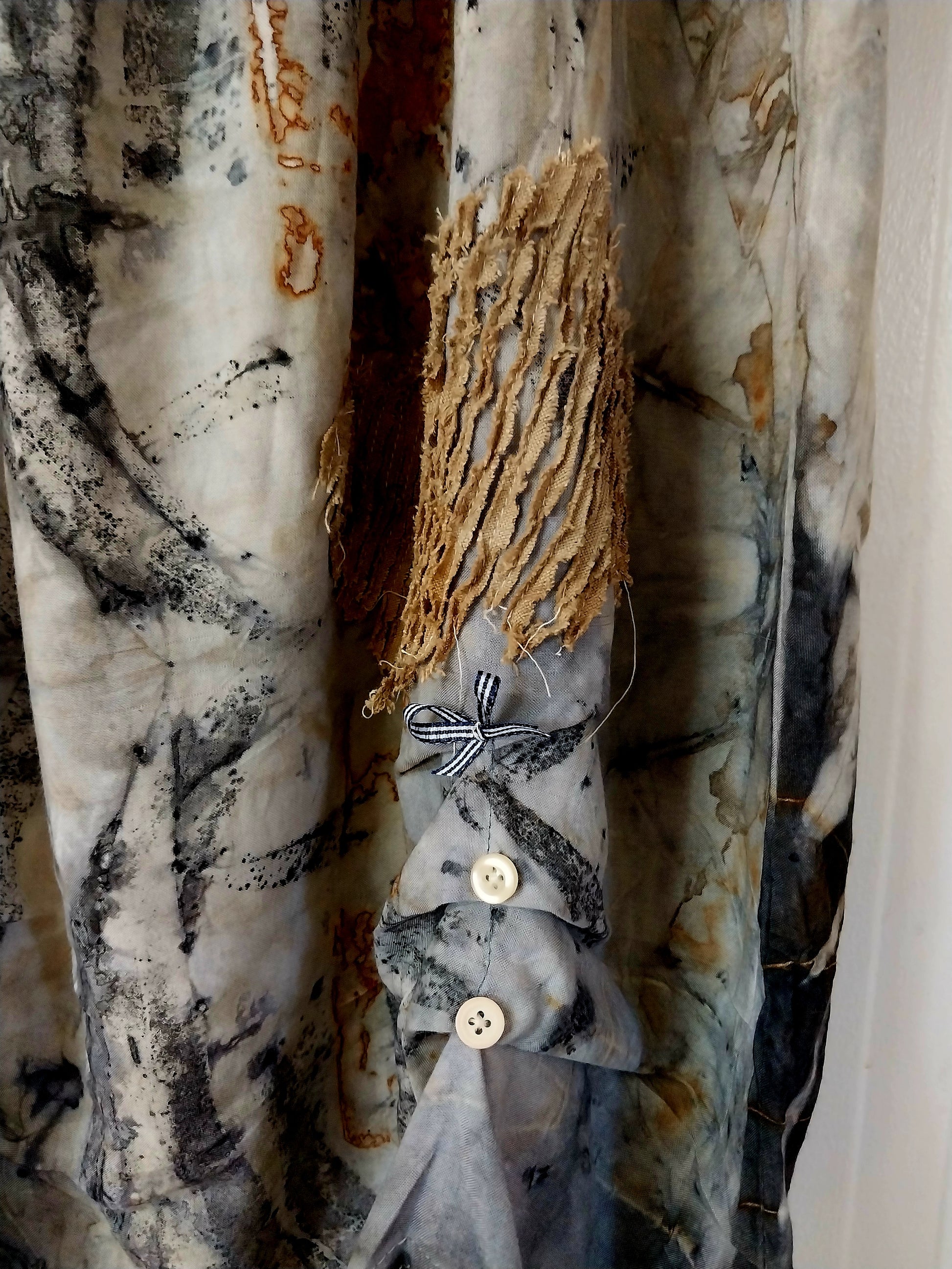 This beautiful hand dyed rayon skirt is a must have. Every skirt is hand dyed with Australian native plants and rusty car parts from the far north of Australia and then hand detailed with cute buttons and ribbons. Cool (literally) and easy to wear with big pockets these are a must have wardrobe item for summer, and a great layering piece for the cooler climates. Each Northern Hustler is a one-of-a-kind wearable piece of art with its own unique catalogue number.