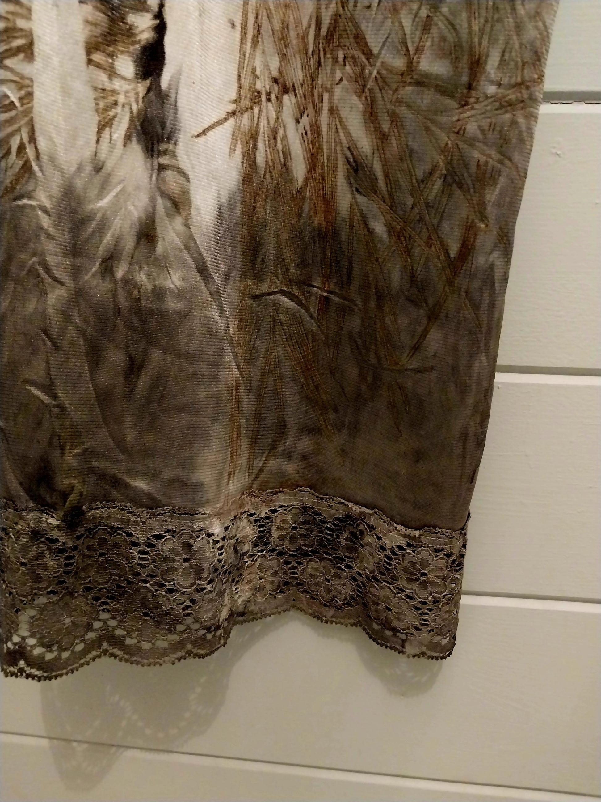 This isn't just a slip dress—it's a provocation. Hand-dyed with Australian native plants and salvaged car parts, each piece emerges as an unrepeatable object, a collision of natural pigment and industrial memory. Vintage lace traces the body with deliberate sensuality. Wear it to blur the line between fashion and fine art, between summer ease and calculated edge. One of a kind. Unapologetic.