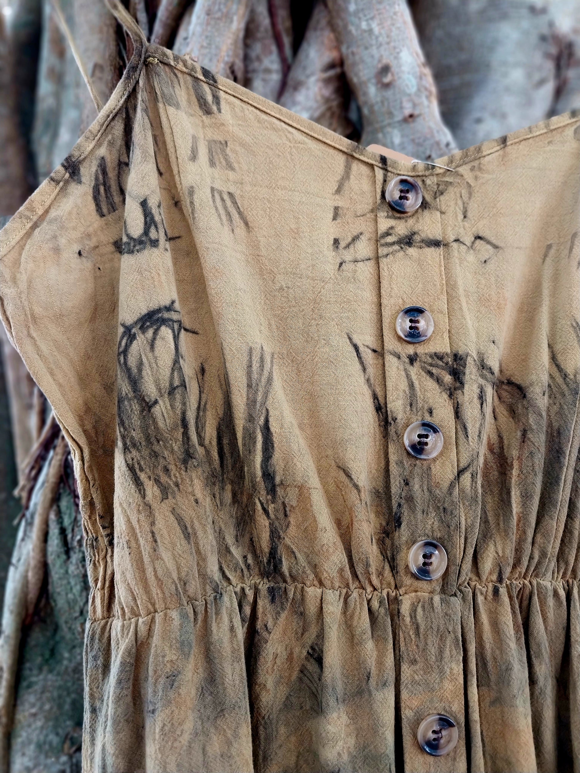 This one-off cute dress is crafted from pre-loved cotton using eco-printing techniques, merging sustainability with expert craftsmanship. This breathable, durable dress offers a unique aesthetic from its natural, reclaimed fibers, making it an ideal choice for environmentally conscious wardrobes.