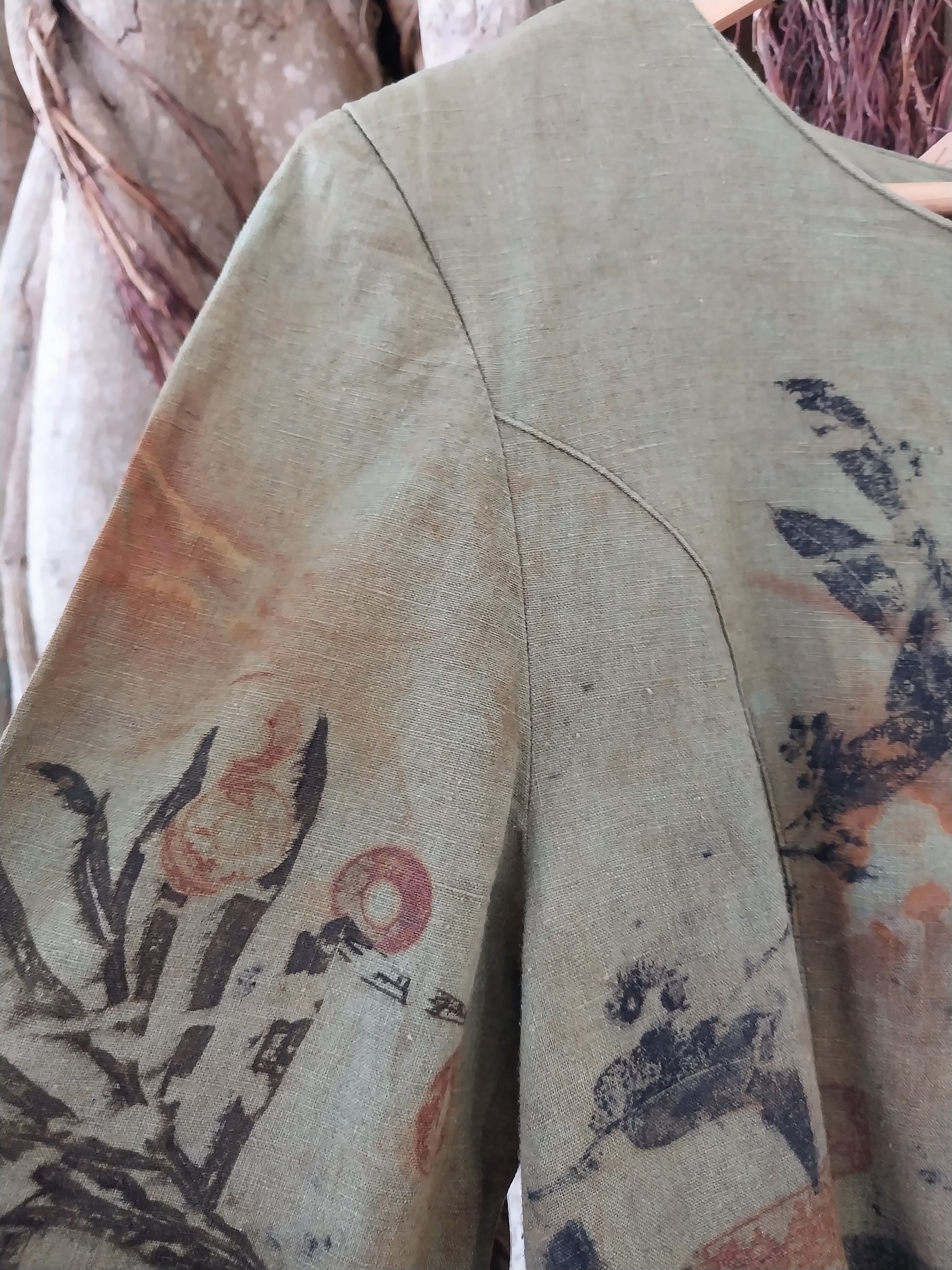 This one-off Vintage dress is crafted from pre-loved cotton using eco-printing techniques, merging sustainability with art. This breathable, durable dress offers a unique aesthetic from its natural, reclaimed fibers, making it an ideal choice for environmentally conscious wardrobes.
